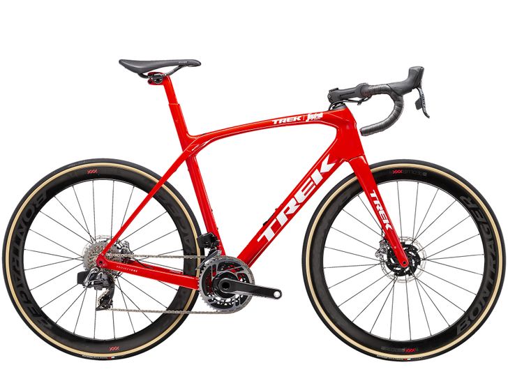 De Domane is al jaren de ‘kasseifiets’ van Trek. Om extra comfort te verkrijgen hebben de Amerikanen iets bedacht wat ze IsoSpeed noemen. Het idee hierachter is dat de zitbuis en bovenbuis als het ware van elkaar ontkoppeld zijn, zodat de zitbuis kan bewegen en schokken vanuit het wegdek verminderd worden. Dezelfde techniek zit in het balhoofd, zodat de stuurbuis kan bewegen ten opzichte van het frame. Zowel aan de voorzijde als aan de achterzijde is de fiets geveerd dus. Fabian Cancellara won er zowel de Ronde als Roubaix mee. Wat opvalt aan de fiets is de 12-speed SRAM Red groep. Hier zit ‘slechts’ een 46-tands buitenblad op (waar 53 en 54 gangbaar is). Dit wordt weer gecompenseerd door een cassette met een kransje met 10 tandjes. Verder is de fiets afgemonteerd met Bontrager wielen en Pirelli banden.