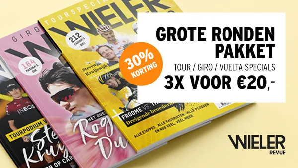Drie keer Wieler Revue voor slechts €20,-! En... dit jaar is het Grote Ronden Pakket veel meer dan alleen Tour, Giro en Vuelta. Wanneer je dit pakket besteld krijg je eerst de Tourspecial van 212 pagina's dik en daarna twee dubbelnummers. Eerst de Giro/WK-special en tenslotte de Vuelta-special/Tour terugblik.
