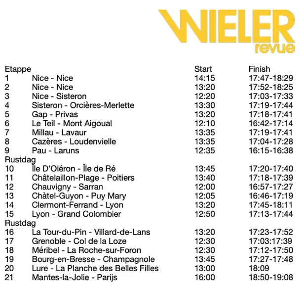 We hebben de start- en finishtijden voor je op een rijtje gezet, in een bestandje dat je eenvoudig uit kunt printen. Het complete roadbook vind je hier.