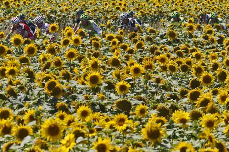 Hét klassieke tourbeeld is natuurlijk een voortrazend peloton met een karakteristiek Frans zonnebloemveld ernaast. Maar hoe zit het met zonnebloemvelden in september, bloeien die dan nog?* Ach, anders monteert de regisseur 'm er wel in; een beetje zoals ze publieksgeluiden bij voetbalwedstrijden erin monteren.