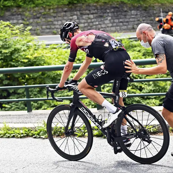 Ook Richie Porte ging op zeventig kilometer van de meet tegen de vlakte, op het eerste gezicht zonder zware verwondingen. Sivakov viel ook al zwaar in de vijfde etappe van de Dauphine. Hij heeft inmiddels een grote achterstand opgelopen op het peloton, dus zijn eventuele klassementsambities kunnen in de ijskast.