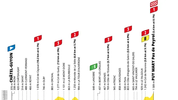 Het is klimmen geblazen! Liefst 4400 hoogtemeters krijgen de renners voor de kiezen in het Centraal Massief. Het is een etappe om de knuppel in het hoenderhok te gooien en de zwakke broeders pijn te doen. Zowel de minder sterke klassementsrenners als de klimmers van wie de ploeg niet al te sterk is. De eerste serieuze beklimming van de dag is de Col de Ceyssat. Met een gemiddeld stijgingspercentage van 5,9 procent over 11,8 kilometer niet superzwaar, maar moeilijk genoeg om te voelen hoe de benen zijn die dag.