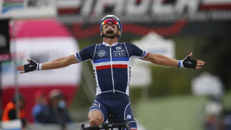 Op die laatste klim probeerden Hirschi en Kwiatkowski het, maar zij kwamen niet weg bij Van Aert (terwijl Dumoulin in zijn eigen tempo dichtbij bleef). Julian Alaphilippe lukte dat wel. Vlakbij de top plaatste hij een verschroeiende demarrage. De Fransman pakte 10 seconden op een groepje met louter kleppers: Van Aert, Roglic, Hirschi, Fuglsang en Kwiatkowski. Dumoulin had die slag nét gemist.