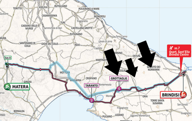 Ideale omstandigheden voor waaiers ontstaan als de wind schuin van achter in de zij staat bij de wielrenners, die door open terrein rijden, zodat de wind, die toch wel minimaal 3 Beaufort moet zijn, vrij spel heeft. Aan die voorwaarden lijkt het geheel der sommen vandaag min of meer te voldoen: er staat een lekker windje in en om Brindisi, de renners komen in het laatste deel van de etappe via een open gebied de havenstad binnen. We vatten het nog even samen in beeld: