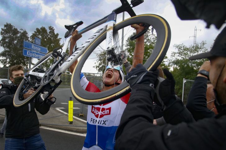 Onzekerheid. Geen zegegebaar op de streep waar van tevoren over nagedacht is. Het checken bij verzorgers en iedereen die maar in de buurt stond. Het checken? Het tien keer checken... Is het zeker? Heb ik 'm? Ik heb 'm! Oerkreet. Fiets de lucht in. Krachttermen. Vriendin omhelzen. Vader omhelzen. Iedereen omhelzen. Het was prachtig. Perfecte ontlading na een perfecte sprint.