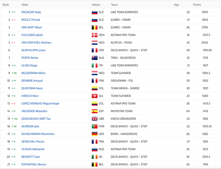 De ranking van de beste ronderenners wordt aangevoerd door Tadej Pogacar, voor Primoz Roglic. Wilco Kelderman stijgt veertien plekken en staat op nummer drie. Op papier hoort Kelderman momenteel bij de drie beste ronderenners van de wereld. Echter, in de Vuelta zijn ook veel punten te verdienen. Geoghegan Hart en Almeida maken ook in deze ranking grote sprongen en staan nu ook in de top-10, als respectievelijk 6e en 8e.