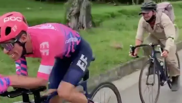 Maar deze verjaardagen vieren we met twee andere filmpjes van de twee. Velon, het samenwerkingsverband tussen verschillende World Team-ploegen, postte op Twitter namelijk filmpjes van beide heren te ere van hun verjaardag. In die van Uran zie je 'm afzien op de tijdritfiets, terwijl er doodleuk een boer in overall in z'n wiel gaat zitten (Uran schonk overigens later een nieuwe racefiets aan deze man).