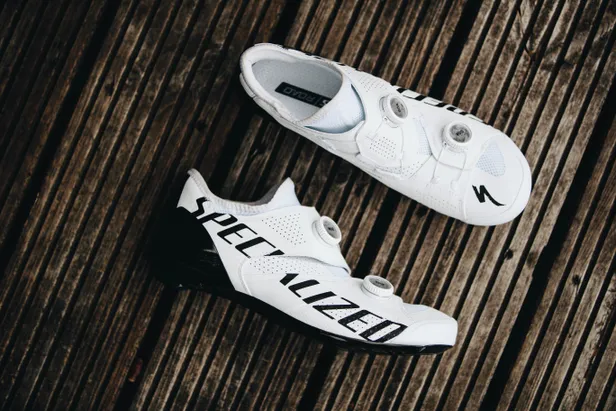 De Ares beschikt over meer dan voldoende ventilatie gezien de vele luchtgaatjes. Hoewel ik voorlopig nog met dikke overschoenen de weg opga, is dit straks in de steeds hetere zomers geen overbodige luxe. Bij het instappen, waarbij ik de BOA Li2 sluitingen wijd uit elkaar moet trekken, is het even zoeken naar de juiste strakheid. De nieuwe BOA’s kunnen nog fijner worden afgesteld dan bij de vorige systemen. Ook hoefde ik tijdens mijn trainingsritten de BOA's niet strakker te draaien: iets wat bij voorgaande modellen nog weleens het geval was na een flinke sprint. Mijn weegschaal geeft 260 gram aan (maat 44) wat betekent dat je de schoen amper voelt als je ‘m optilt. De sluitingsdruk wordt netjes over de hele voet verdeeld. Vergeleken met de S-Works 7 schoenen, die qua elegantie ongeëvenaard zijn, is er, naast het gereduceerde gewicht, progressie geboekt door het feit dat de onderste klittenbandstrip is verwijderd. Die is overbodig geworden doordat BOA's nu verder uit elkaar staan dan bij het vorige model. Ook zijn de twee draaiknoppen dichter tegen de wreef aan geplaatst wat een prettiger gevoel tijdens het fietsen.