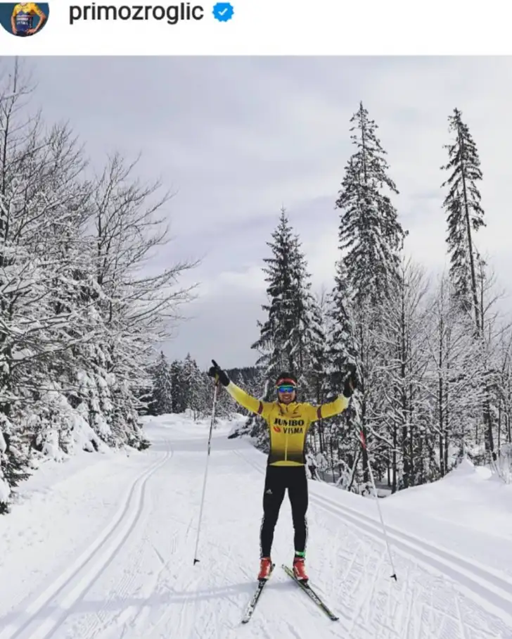 Hij gaat elke dag voor het ontbijt even een rondje hardlopen, verklapten we al in het artikel over de beste hardlopers onder de wielrenners, maar met de lange latten heeft Roglic uiteraard ook ervaring. Hij sprong er lang mee van schansen, maar ook van een stukje langlaufen is hij niet vies...
