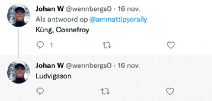 Hier een screenshotbloemlezing van de namen die nog meer binnenkwamen als antwoord op de tweet van onze Finse vriend.