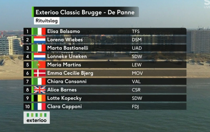 Die krachtsinspanning zorgde ervoor dat Balsamo relatief vrij simpel naar de zege kon sprinten met anderhalve fietslengte voorsprong. Wiebes werd wel tweede. Met Lonneke Uneken van SD Worx op de vierde plaats was er nog een tweede Nederlandse in de top 5.