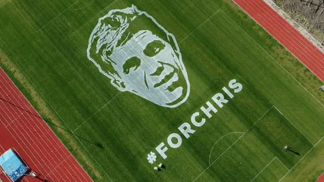 Één moment waarop dat gebeurde was bij een megagrote beeltenis van de betreurde Deen op een voetbalveld dat door de regie fraai vanuit de helikopter in beeld werd genomen, zoals in de afbeelding hierboven te zien.