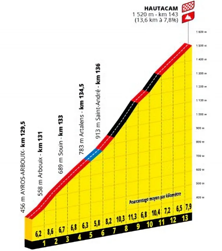 Een onbekende col in de Tour de France, maar daarmee niet minder zwaar. De 10,4 kilometer aan 8,1 procent zal na bijna drie weken koers slachtoffers eisen. De eerste kilometer gaat aan 10,4 procent omhoog, terwijl ook het slot van de klim niet misselijk is. En dan moet de Hautacam nog komen. De Hautacam kent vooral een zwaar middenstuk en is met 13,7 kilometer aan 7,8 procent een waardige laatste zware col van deze Tour de France.