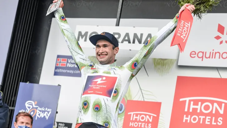De ritwinst en leiderstrui gingen in het regenachtige Noorwegen in de eerste etappe naar de Fransman Axel Zingle, maar de felbegeerde pauwentrui was voor de Amerikaan Stephen Bassett. Je ziet hem er hierboven in shinen, maar hieronder kun je 'm in al z'n puurheid bewonderen.