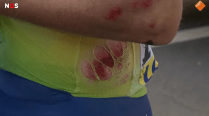 Terpstra kijkt eens naar beneden en ziet wat de schade is. "Gedverderre, heel mijn pak naar de kloten." Daarbij vergeet Terpstra te vermelden dat hij zelf ook 'naar de kloten' is. Zoals je hieronder zelf kunt zien in een screenshot van de NOS bleef het niet alleen bij kleerscheuren.