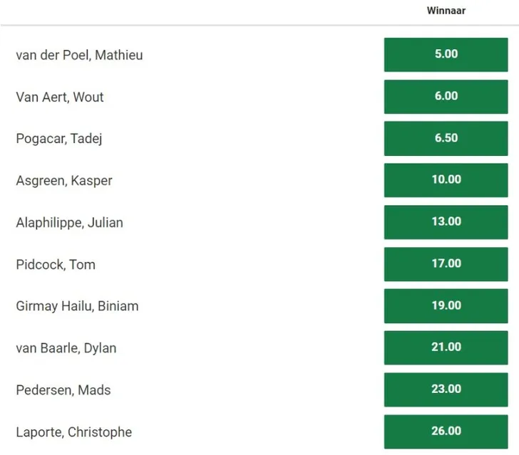 Vlaanderens Mooiste vindt op twee april plaats. Bij Unibet zijn ze er van overtuigd dat Mathieu van der Poel er voor de derde keer gaat winnen. Wout van Aert en Tadej Pogacar nemen plaats twee en drie in.