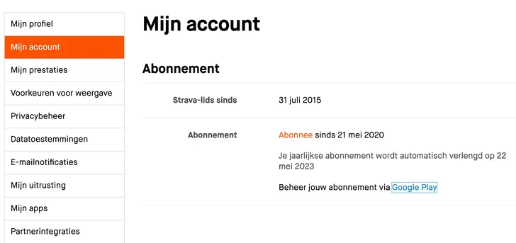Ga op je Strava-account naar Instellingen en kies daar Mijn Acount. Daar verschijnt dan het volgende scherm (dit is op desktop, op telefoon ziet het er waarschijnlijk anders uit..)