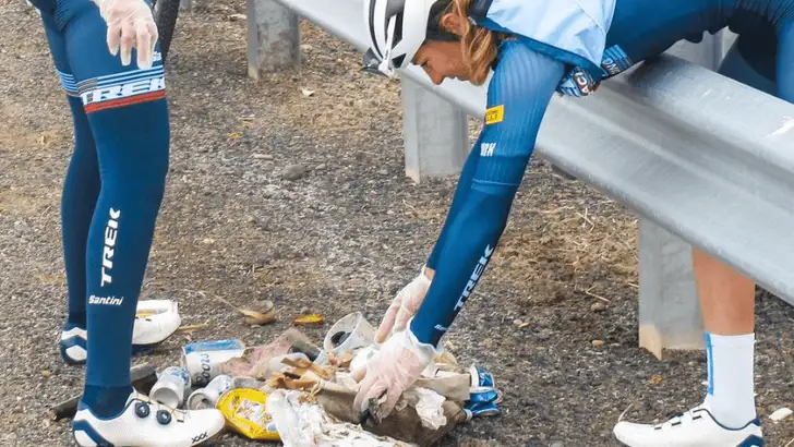 Maar het gaat toch wel steeds beter. In de koers is het tegenwoordig verboden om de wikkels nog weg te gooien buiten de zogenaamde litter zones en bovendien staken twee mountainbikesters van het Trek Factory Racing-team afgelopen weekend de handen uit de mouwen tijdens Earth Day.