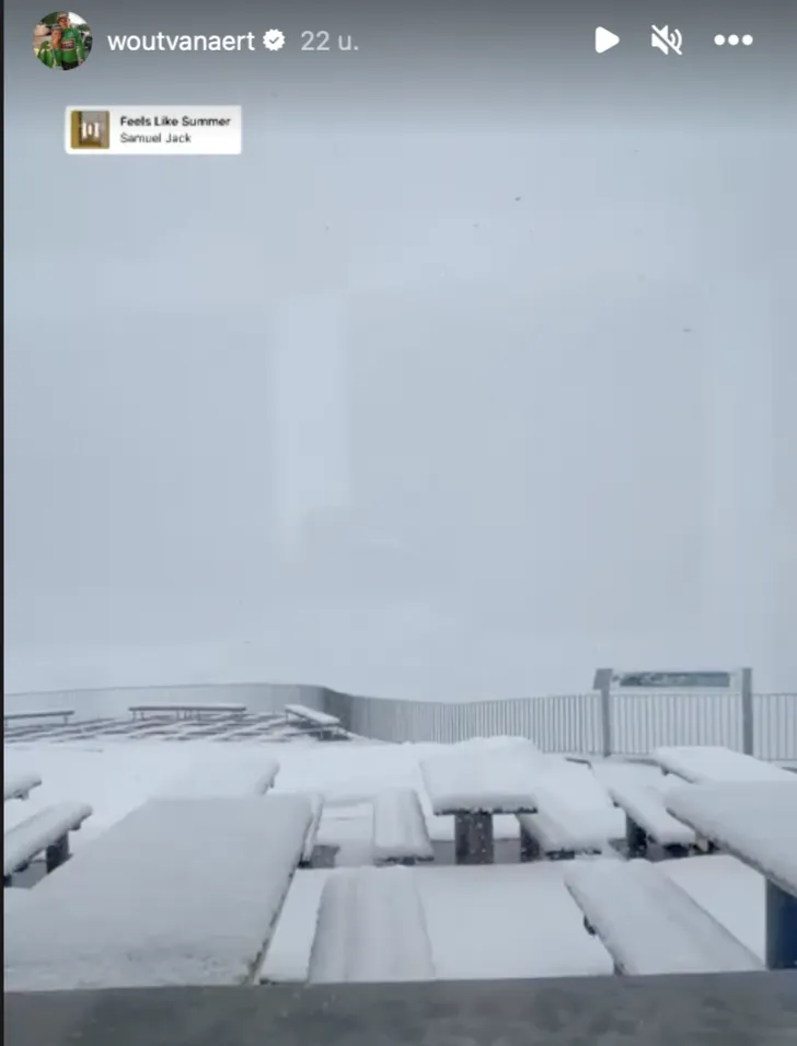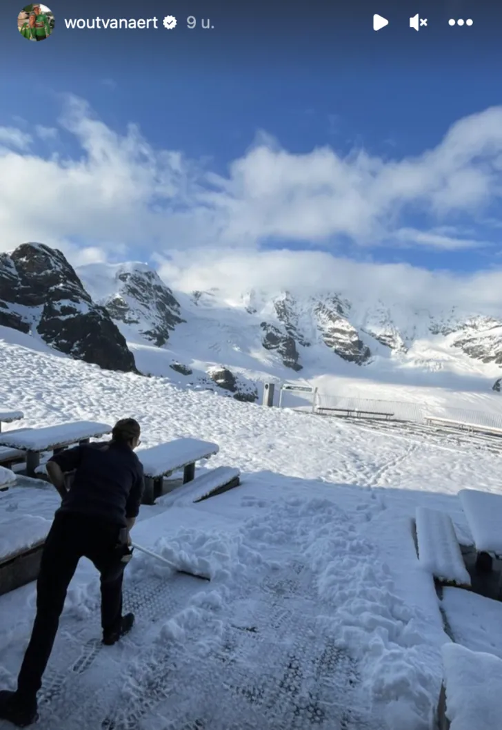 Op zijn racefiets moest hij nog even wachten en dus koos Van Aert de eerste dagen voor enkele gravelritjes langs de prachtige Zwitserse berglandschappen. Toen scheen de zon nog, maar ondertussen is het flink aan het sneeuwen in de buurt van St. Moritz, waar Van Aert verblijft. Op Instagram deelde hij enkele beelden van zijn terras dat bedekt is met een dik pas sneeuw.