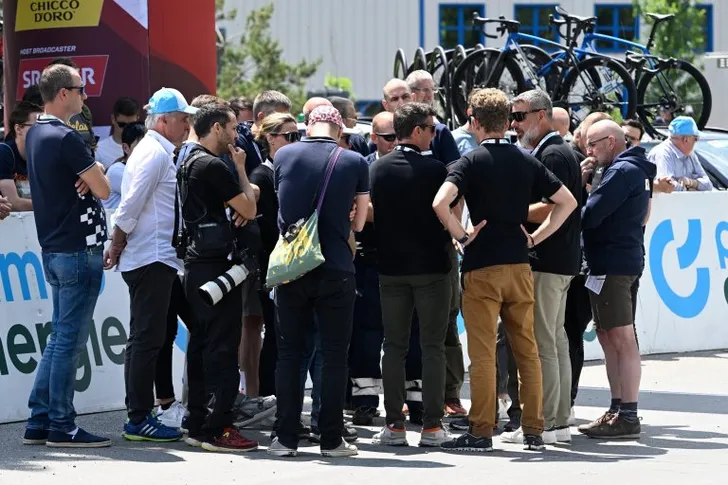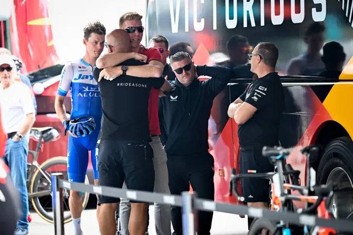 In het peloton is de verslagenheid groot. Aan de finish zochten renners en teampersoneel massaal steun bij elkaar. Enkele beelden: