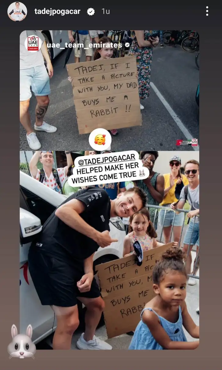 De foto van het vergulde meisje met Pogacar werd gepost op de Instagram van UAE Team Emirates en ook gedeeld door Pogacar zelf na de etappe. Of het meisje zo blij kijkt omdat ze een konijn krijgt óf omdat ze met de Sloveen op de foto staat, is onbekend. We gaan er wel vanuit dat het konijn de naam Tadej zal krijgen.
