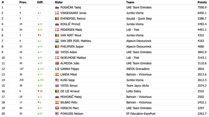 Het wonderkind uit Slovenië telt op dit moment 7500,9 punten en doet een pak beter dan zijn eerste achtervolger, Jonas Vingegaard. De Tourwinnaar heeft op dit moment 6450,1 punten. Remco Evenepoel is de beste Belg op een derde plaats. De wereldkampioen tijdrijden telt 5386,7 punten.
