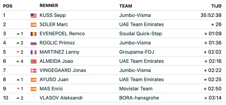 In de tijdrit kreeg kreeg Jonas Vingegaard van de klassementsmannen toch wel de grootste tik. De Tourwinnaar verloor 1’02 op Evenepoel en deed maar ietsje beter dan Sepp Kuss. De Amerikaan reed een prima tijdrit en blijft leider in het algemene klassement. Marc Soler staat nog steeds tweede, op 26 seconden. Remco Evenepoel staat derde op 1’09.