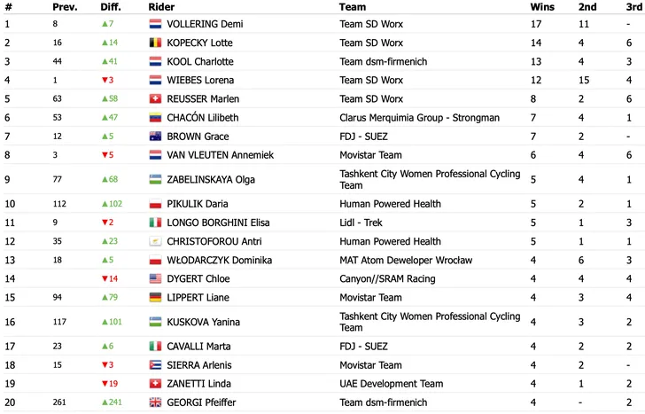 Haar Belgische ploeggenote Lotte Kopecky staat tweede op de ranglijst met 14 zeges. De wereldkampioene werd vier keer tweede. Sprintbom Lorena Wiebes heeft dit seizoen 13 overwinningen geboekt en strandde 15 keer op de dichtste ereplaats.