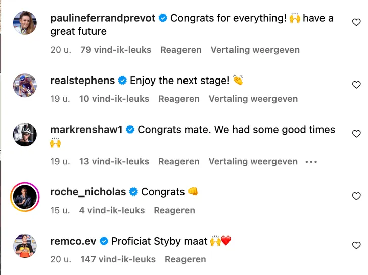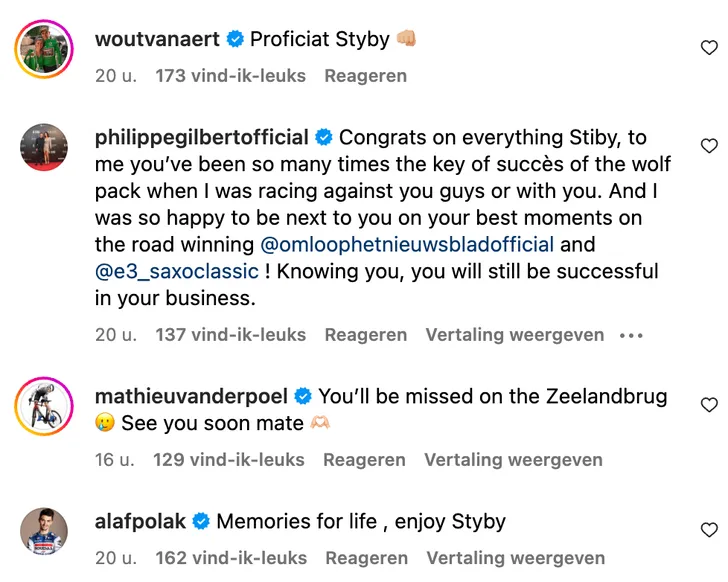 Dat Zdenek Stybar, of Styby voor wie 'm beter kent, populair is in het peloton bleek wel uit alle reacties van collega's onder de post. Onder andere Wout van Aert, Philippe Gilbert, Remco Evenepoel, Julian Alaphillippe en Mathieu van der Poel reageerden.