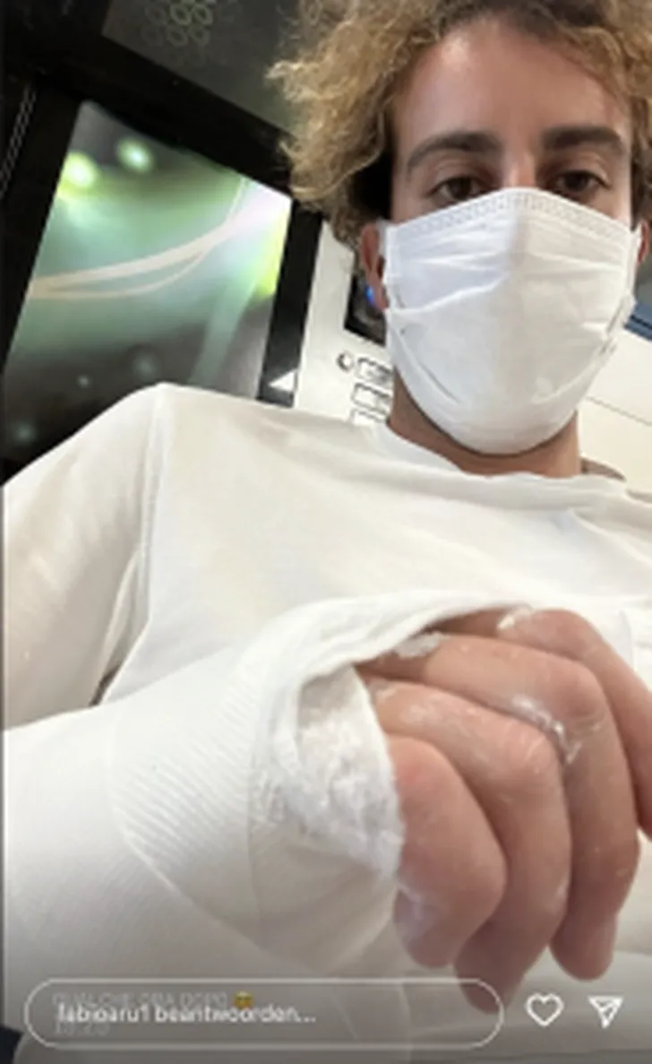 De voormalige winnaar van de Vuelta smakte tegen het asfalt en brak daarbij zijn duim. Hij liep geen andere verwondingen op. Via Instagram deelde Aru enkele foto's van zijn gebroken duim, die helemaal scheef stond. In het ziekenhuis werd hij meteen geopereerd. Aru zal nog een tijdje met een gips moeten rondlopen.