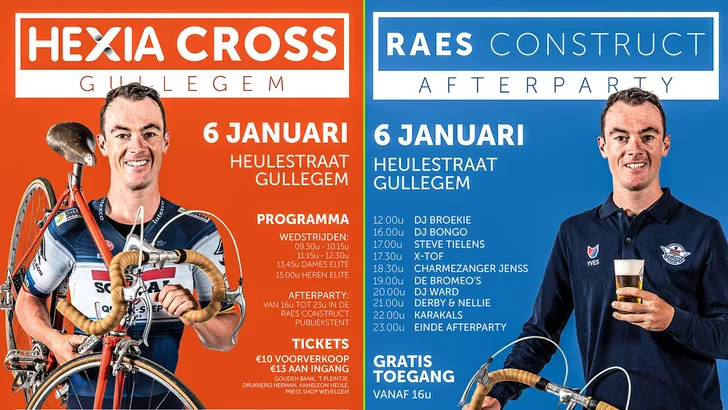 En niet alleen van de cross. Hij siert ook de poster van de afterparty in Gullegem. Waar hij bij de cross een fraaie retrofiets vasthoudt, doet hij er op die poster nog een biertje in z'n linkerhand bij.