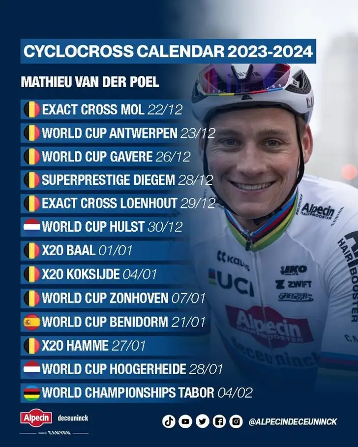 De Zilvermeercross in Mol heeft op zaterdag 22 december de primeur. Het is ook meteen de opening van een heel drukke kerstperiode waarin Van der Poel tot en met 1 januari bijna elke dag op de fiets stapt voor een wedstrijd in België - en eentje in het Nederlandse Hulst.