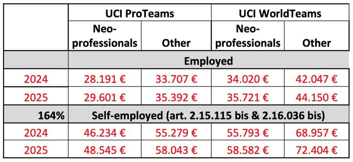 Voor de mannen is er echter goed nieuws. Rennersvakbond CPA en de AIGCP zijn het eens over een verhoging van het minimumloon. Het akkoord is wel maar van toepassing vanaf 2024. De bedragen kan u hieronder terugvinden. 'Self-employed' betekent dat de renners zelf hun sociale bijdragen moeten betalen, waardoor de lonen hoger liggen. Het betref overigens brutolonen, dus van die bedragen moet nog een groot deel aan belastingen afgetrokken worden.