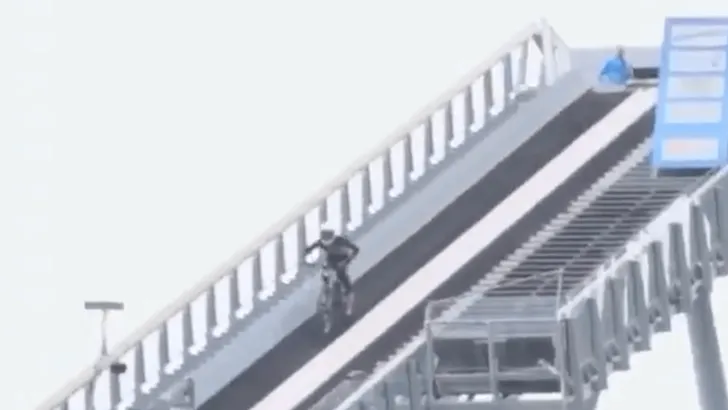 Mountainbiken doe je het best in de bergen of de bossen. Schansspringen kan enkel op een schans. Een lefgozer waagde zich aan het beste van de twee werelden. Hij reed met zijn mountainbike van een schans naar beneden, nam de sprong en besefte vrij vlug dat dat helemaal geen goed idee was...