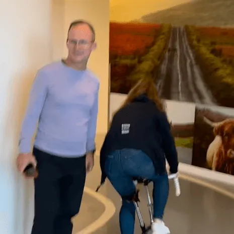 Het minifietsje heeft zelfs een tijdritstuur, maar die positie durfde Van Anrooij begrijpelijkerwijs niet aan. Daarom zie je haar in onderstaand filmpje dansend op de pedalen de trappers heel snel ronddraaien.