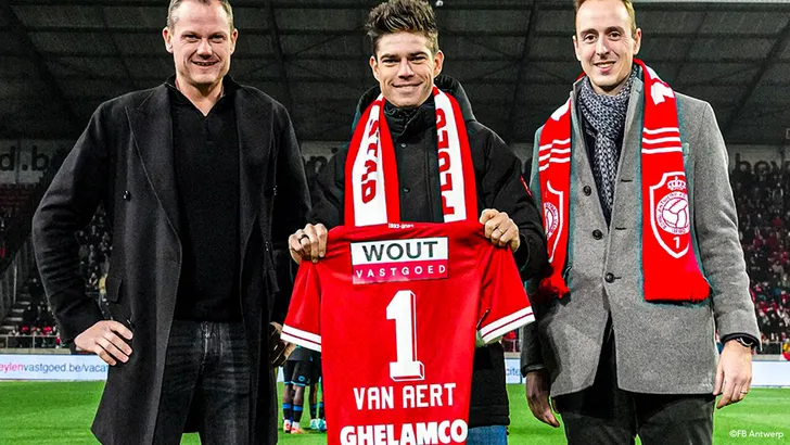 Op het shirtje dat hij kreeg staat op de achterkant Wout Vastgoed. Dat is een verwijzing naar Heylen Vastgoed, dat een sponsordeal heeft met de Antwerpse club. Van Aert heeft geïnvesteerd in dat bedrijf en is minderheidsaandeelhouder. Hier zie je het shirtje.