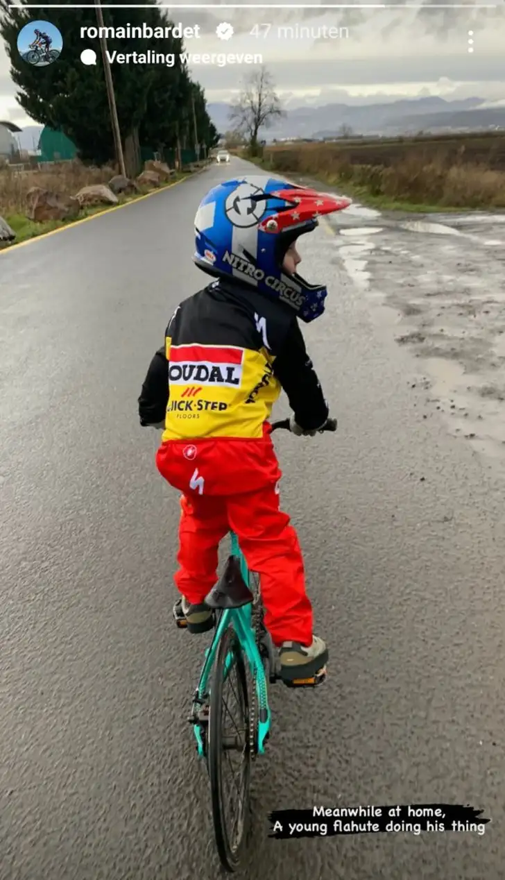 Zaterdag postte Bardet een foto van zijn zoontje, die op de fiets zat en de kampioenstrui van Evenepoel droeg. "Ondertussen thuis, een jonge racer die zijn ding doet", schrijft Bardet bij de foto. "Blij dat hij het cadeau leuk vindt, mijn vriend", reageerde Evenepoel op zijn beurt.
