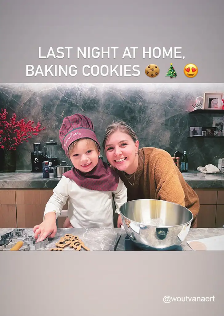 Van Aert nam wel in stijl afscheid van zoontje Georges. Het hele gezin (Jerome is er nog wat te jong voor) ging koekjes bakken de avond voor Van Aert het huis in Herentals verliet.