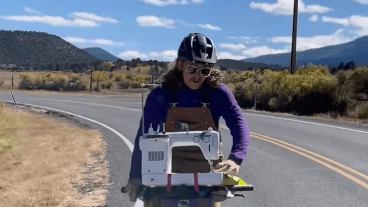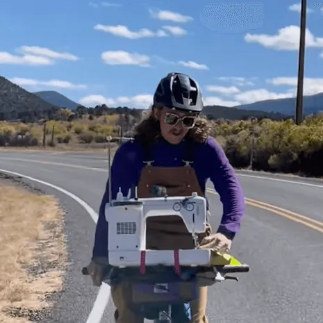 Hier komt niet een ouderwetse naald en draad aan te pas, maar hij heeft voor de gelegenheid een naaimachine op z'n fiets gemonteerd en je ziet hem al rijdend over de Amerikaanse wegen bezig op z'n naaimachine. Wie zei er ook alweer dat mannen niet kunnen multitasken...