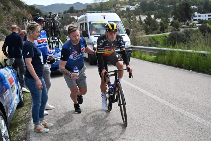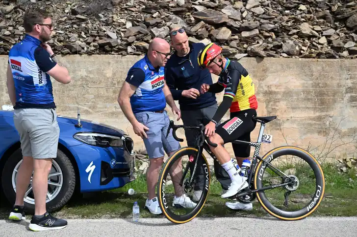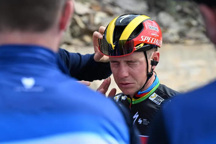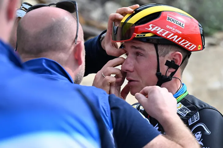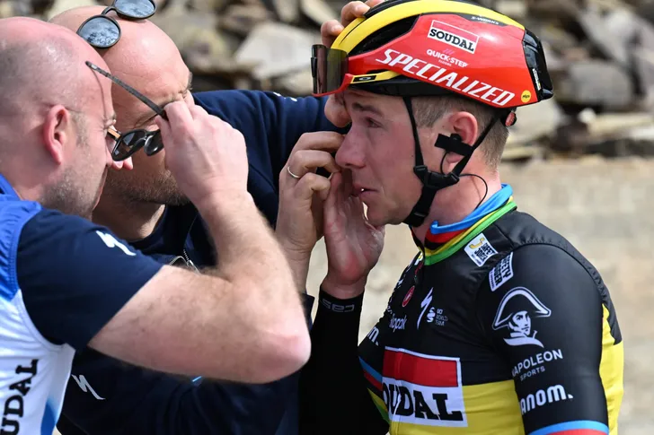 Op zo'n 125 kilometer van de aankomst stond de Belgische kampioen plots aan de kant. Remco Evenepoel had duidelijk een probleempje in zijn rechteroog. Vier verzorgers schoten hem te hulp, waarna hij terug zijn weg kon verder zetten. De ploeg laat aan Het Laatste Nieuws weten dat er insect in het oog van Evenpoel was gevlogen.