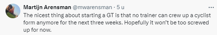 Hij zegt in enigszins filosofisch klinkende woorden dat de trainer van Arensman het volgens senior flink heeft verpest, maar dat die het hopelijk niet te veel heeft verpest.