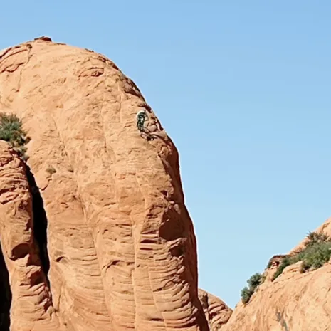 Als wij naar onderstaand filmpje kijken, doen we het plaatsvervangend in onze broek, maar Bron lijkt nergens bang voor. De rots waar hij vanaf rijdt met z'n fiets lijkt wel een helling van op z'n minst 45 graden te hebben.
