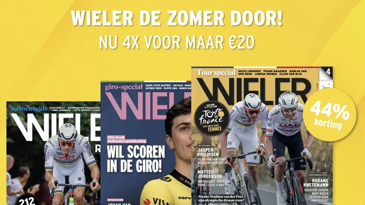 Notabene: je ontvangt niet onze Tourspecial als je je opgeeft voor deze actie. Die kun je hier nog wel los kopen. Het gaat om de eerste vier nummer die na de Tour de France verschijnen. Daarin lees je natuurlijk wel een uitgebreide terugblik op de Tour en zal er ook aandacht zijn voor Vuelta en Tour de France Femmes. Bovendien staat het WK in september ook alweer op de rol.
