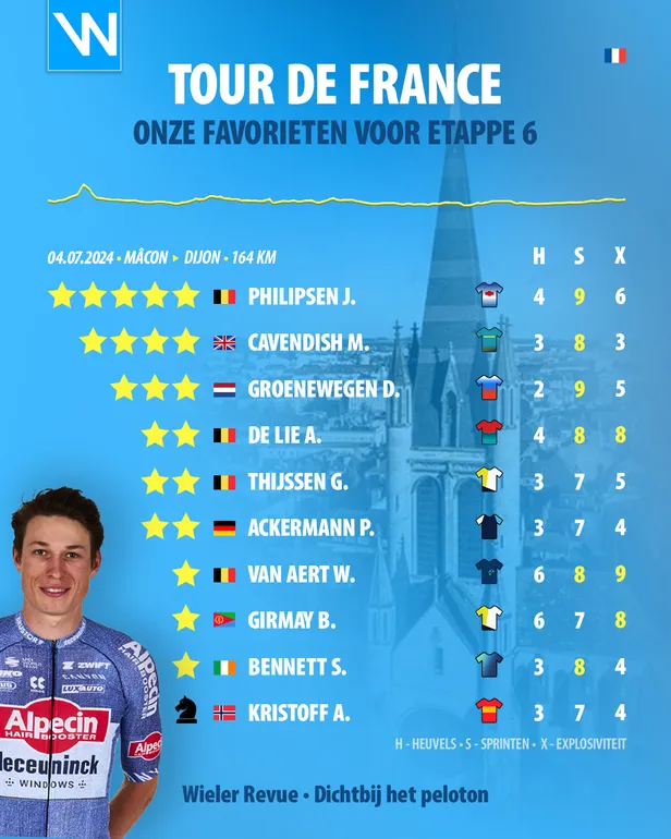 ‘Fans van middeleeuwse architectuur worden getrakteerd op luchtfoto’s van de abdij van Cluny en daarnaast nog heel veel meer. De kopgroep zal op pad gaan met de ambitie om het peloton af te houden, maar de sprinters zullen het laatste woord moeten hebben in de laatste achthonderd meter naar de finish’, vertelt koersdirecteur Christian Prudhomme over de zesde etappe. Kortom, niets houdt een massasprint tegen.