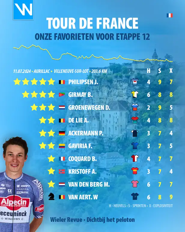 “De mooie landschappen in de regio’s Cantal en Lot zullen de aanvalsspecialisten niet afleiden van de wetenschap dat er iets voor ze valt te halen in de twaalfde etappe. Het terrein hier bestaat vooral uit heuvels met de Rocamadour-helling die vooral in het oog springt.”