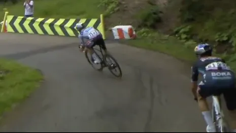 Tijdens de laatste afdaling richting aankomstplaats Le Lioran ging Roglic onderuit in een haarspeldbocht. Hij werd op dat moment onder druk gezet door Remco Evenepoel, die zich als een steen naar beneden gooide. In aanloop naar die bocht lag er een stukje nat wegdek. (Lees verder onder de beelden)