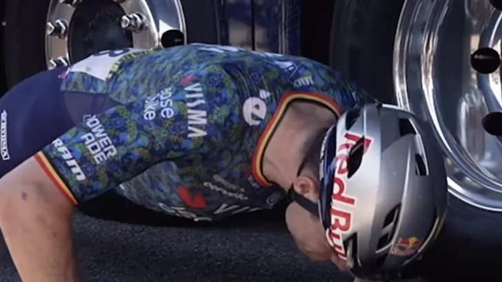 Hieronder kun je het filmpje bekijken. Van Aert zei meteen na afloop al spijt te hebben, maar in de rit zelf leek het geen effect te hebben, want hij deed voorbeeldig werk voor de ploeg.