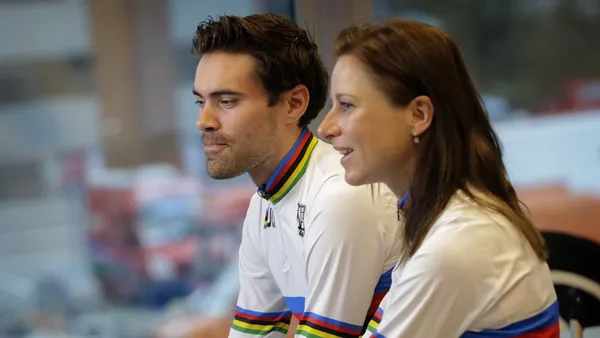 Tom Dumoulin en Annemiek van Vleuten zijn nu alweer een poosje gestopt met wielrennen. Ze hebben veel gemeen: allebei zijn ze nu analist voor de NOS en - zoals je op de foto ziet - allebei werden ze wereldkampioen tijdrijden in het Noorse Bergen.