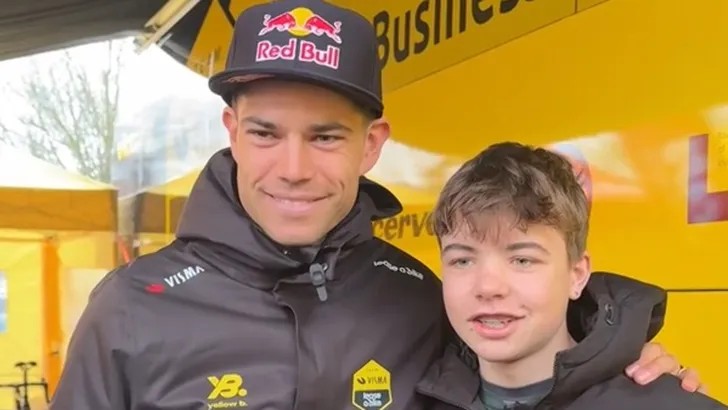 Dat de ontmoeting tussen de prof en de nieuweling bijzonder is, beseft de grote Wout van Aert maar al te goed. "Al denk ik niet dat ik op die leeftijd al bij een profrenner had gestaan", zegt hij. "Ik stond vooral vanop afstand te gluren, of ging stiekem kijken op de parkeerplaats. Dus snap ik wel dat dit vandaag echt een belevenis is voor hem."