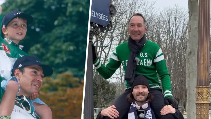 Maar naast die oude foto zie je ook een screenshot van een recent moment. Bij een bezoekje aan de Franse hoofdstad draaiden ze de rollen namelijk eens om. De met profwielrennen gestopte Rick nodigde zijn vader uit om bij hem op z'n schouders plaats te nemen, uiteraard in een groen shirt.